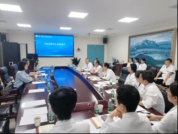 2025年9月17日下午,我院召开科技成果转化交流座谈会。出席会议的有南京市转化医学研究院副院长、高级技术经理人胡鹏,徐州医科大学附属医院金培生院长、王志萍副院长,临床研究院袁峰院长,科技处张沈阳副处长,以及神经内科、整形美容科、医学工程处等学科带头人。