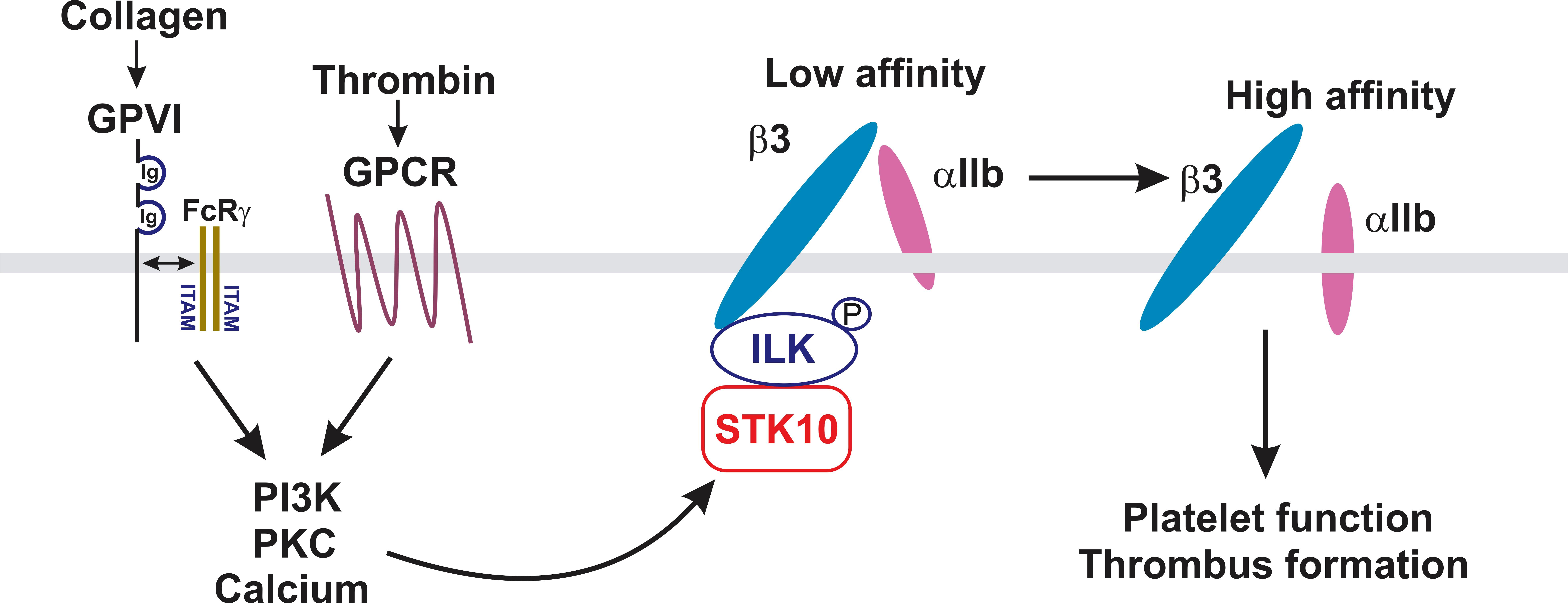 该研究首先在血小板内检测到STK10的表达,为进一步探索其在血小板功能和血栓形成中的作用,研究团队构建了血小板特异性STK10敲基因小鼠。利用出血、动脉血栓和血栓炎症(败血症)模型,研究发现敲除血小板STK10显著抑制血小板参与体内止血、动脉血栓形成及血栓炎症反应。体外血小板功能分析显示,敲除STK10显著抑制了血小板聚集、alpha颗粒释放、促凝活性、aIIbb3活化、血小板铺展和血块收缩。定量磷酸化蛋白组学分析发现,敲除STK10引起血小板活化后多种差异蛋白的磷酸化,而这些差异蛋白主要富集在血小板活化、细胞骨架重排、focal adhesion等。进一步通过利用IP-MS方法,鉴定到整合素连接蛋白激酶(ILK)是STK10蛋白激酶的底物。敲除STK10显著降低ILK的磷酸化水平。而ILK被报道参与调控血小板功能和血栓形成。最后,为探索本研究发现的临床相关性,研究团队检测了败血症(血栓炎症)病人血小板中STK10和ILK的活化,发现同健康人群血小板相比,败血症病人血小板中STK10和ILK的磷酸化水平显著增加,同时血小板活化水平(P-selectin表达)也显著升高,提示STK10/ILK的过度活化可能参与败血症中血栓炎症反应的发生和发展。