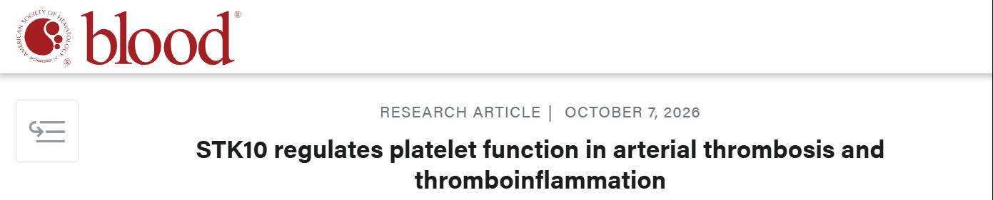 本项研究揭示了蛋白激酶STK10在调控血小板参与动脉血栓和血栓炎症反应中的新机制,为血栓相关疾病的治疗提供潜在策略和靶点。